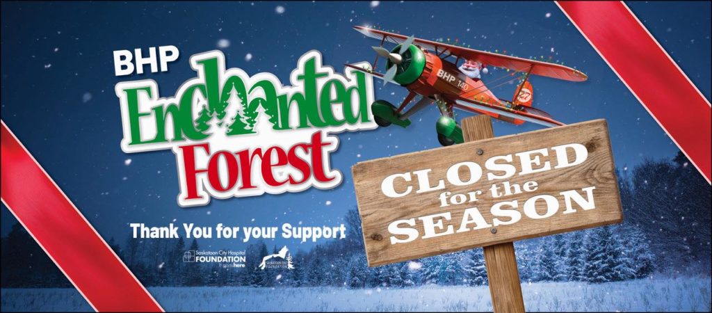 The 27th anuual BHP Enchanted Forest runs November 15, 2025 to January 4, 2026. Come see the new display “Santa’s Runway” and enjoy all your favourite light displays from past years.
